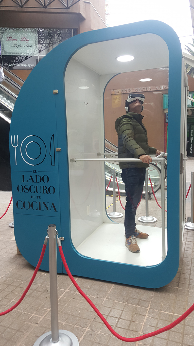 The project was designed for a BTL display (Below the Line). The product was shown just at the end and for that, we installed a VR cabin in the middle of a crowded street in Santiago Chile, where the people were able to see what went on in the microscopic world of bacteria, and could learn that their clean kitchen might not be as clean as they had imagined.