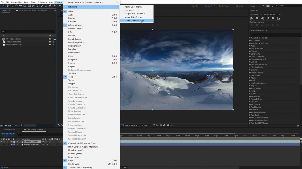 Mantra VR is a 360/VR plugin for After Effects and Premiere Pro. It is a set of 16 stylization and practical effects that you can apply directly onto your 360 footage, available now for $229. Mantra VR is designed by the creators of SkyBox Suite, which has been acquired by Adobe, that are now fully integrated in Adobe Creative Cloud.
